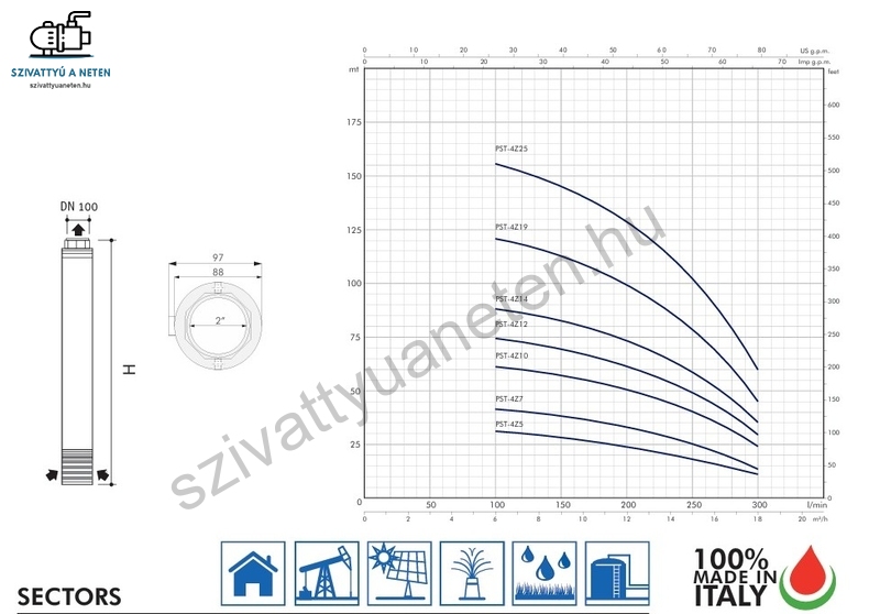 A 100% -ban Olaszországban készült PST Techology SANDFIGHTER 4Z12-T búvárszivattyú minimum DN110 átmérőjű kútban használható. A kiemelkedő homoktűrő képességnek köszönhetően, akár 800 g/m3 homok jelenlétében is alkalmas a víz szivattyúzására. A PST búvárszivattyú magas minőségű anyagok felhasználásával készül (AISI 304 és AISI 316 rozsdamentes acél, homoktűrő technopolimer, sárgaréz kombinációval). A berendezések telepíthetőek függőlegesen és vízszintesen (18 járókerékig) is. A berendezések gyárilag beépített (igény szerint leszerelhető) visszacsapó szeleppel kerülnek kiszállításra, a tápkábel hossza 1,5m, melynek szakszerű hosszabbítására felár ellenében lehetőséget biztosítunk. A 400V-os PST búvárszivattyú megfelelő motorvédelméről ne felejtsen el megfelelően gondoskodni!